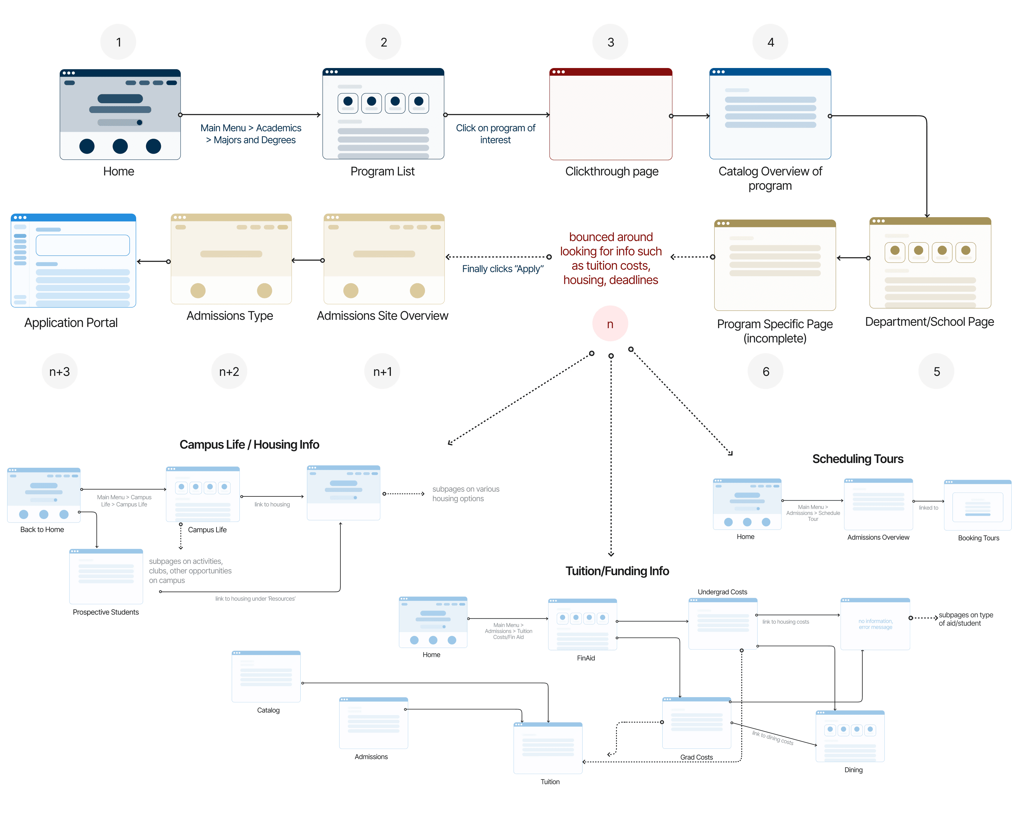 Usability Test Example 2A — Locating Undergraduate Tuition & Costs: Ideal Path (Left) vs. Actual User Paths (Right)