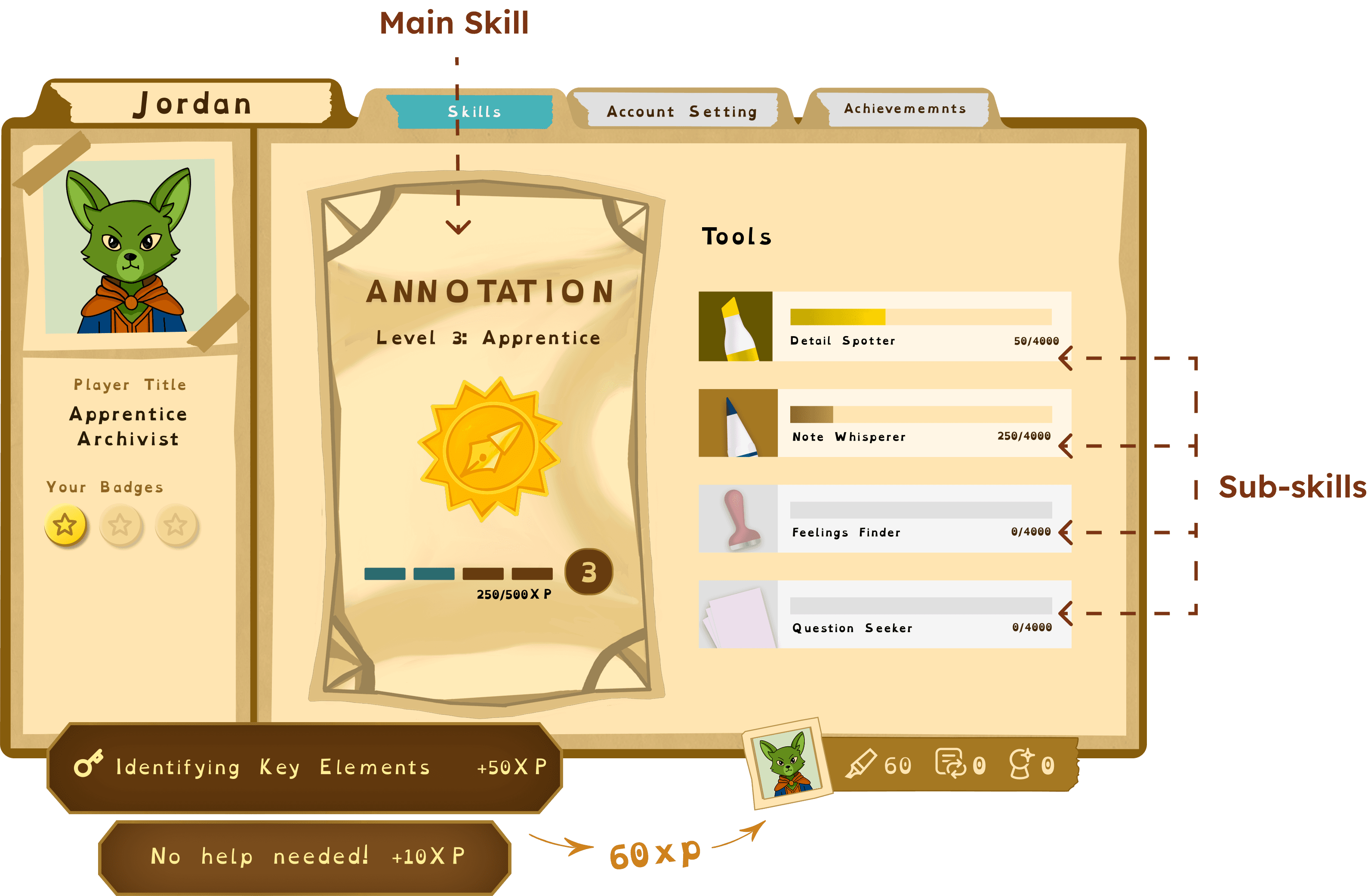 Tool-specific progress meters unlock new "powers" as students master each comprehension strategy, creating clear advancement paths tied to skill development, not time spent.
