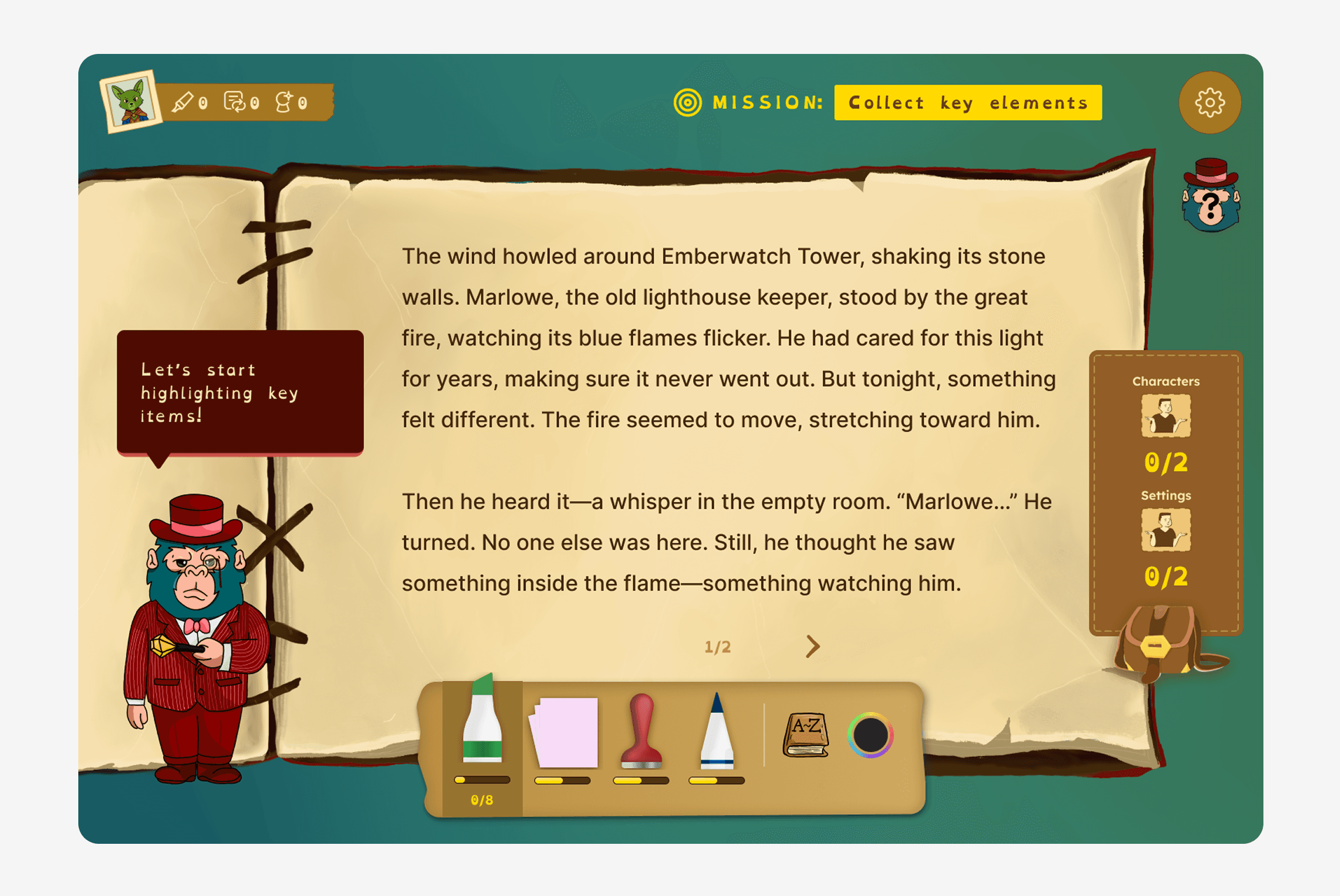 A narrative-driven reading game that helps students practice essential comprehension strategies independently through scaffolded missions, playful storytelling, and feedback-driven reflection.