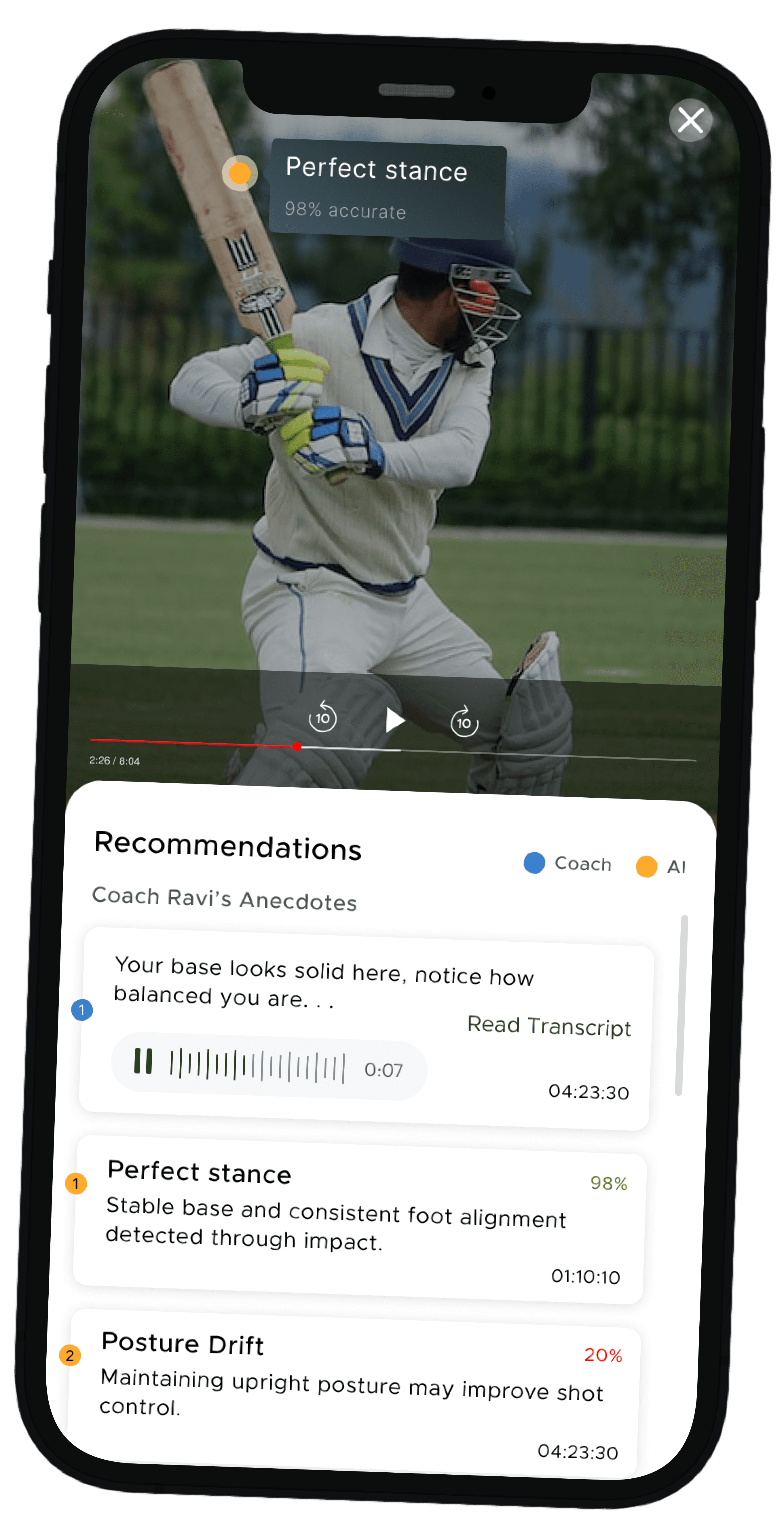 AI visual markers highlight key moments (stance, foot placement, follow-through) directly on video