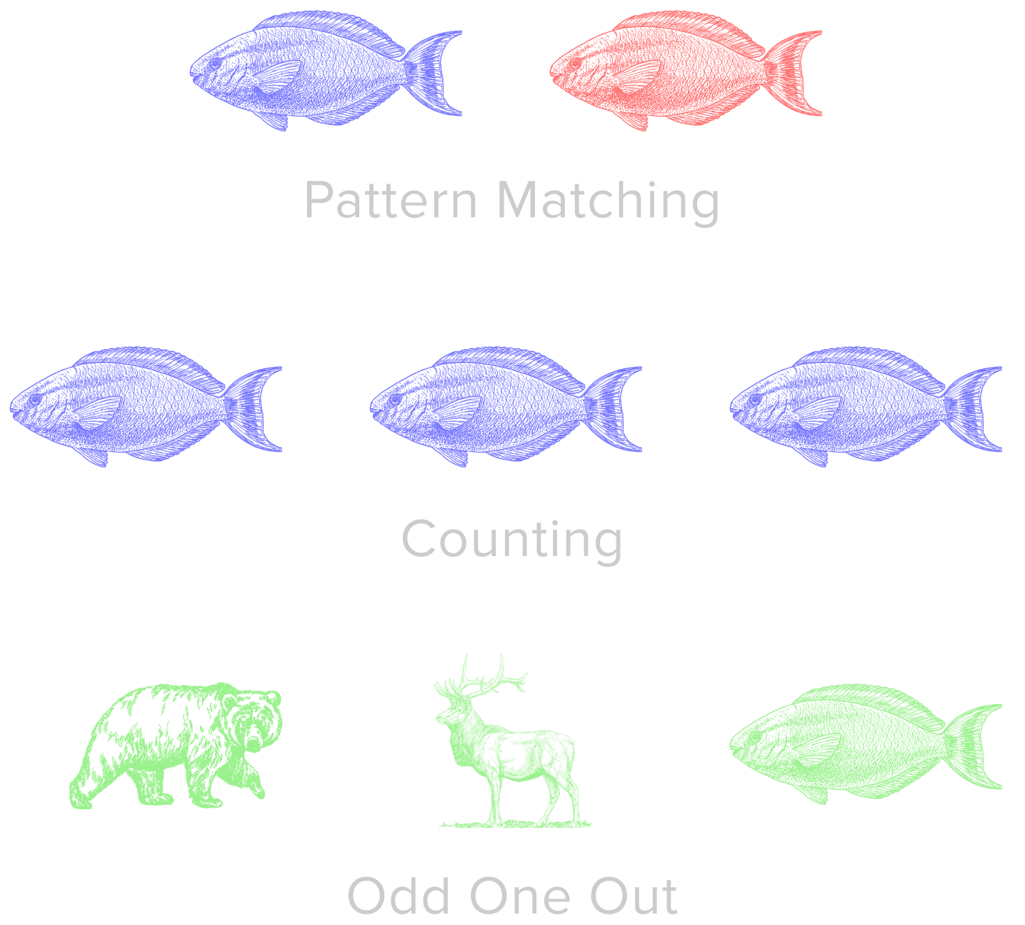 Each scene shows three animals, two belong, one doesn’t. Children identify which animal is in the wrong place.