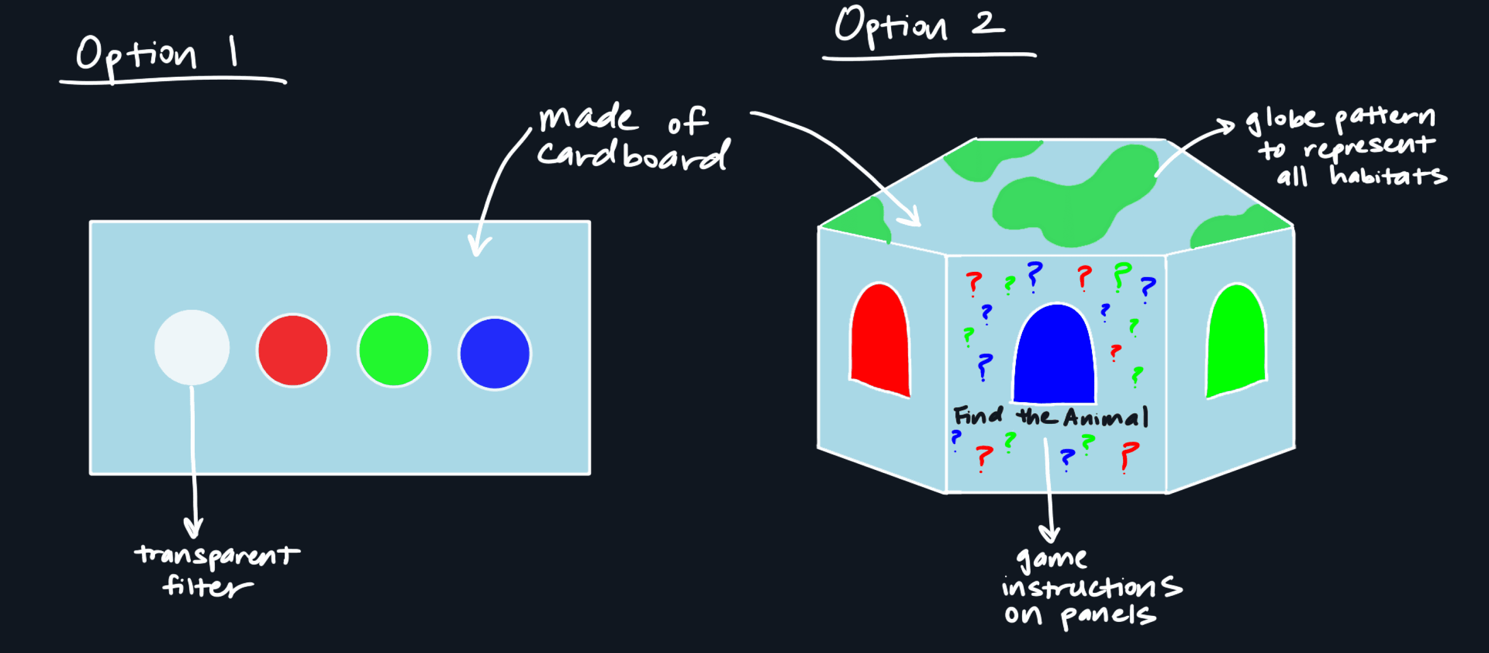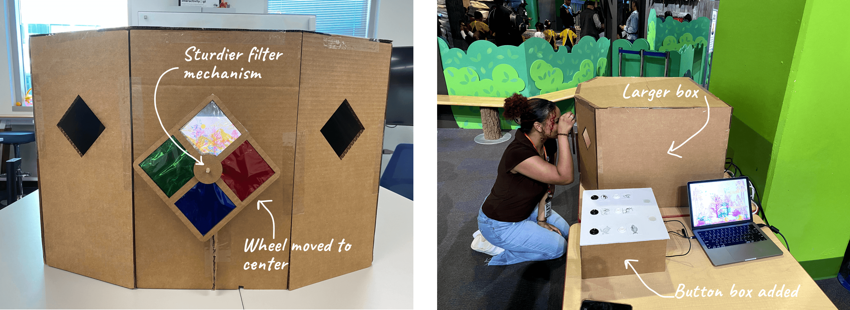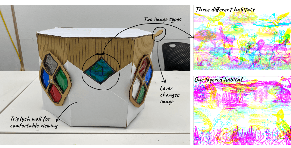 Our first prototype was a small cardboard viewing box with two color filter wheels and static layered images. We tested whether the filter mechanism was intuitive and which image layering style worked best.