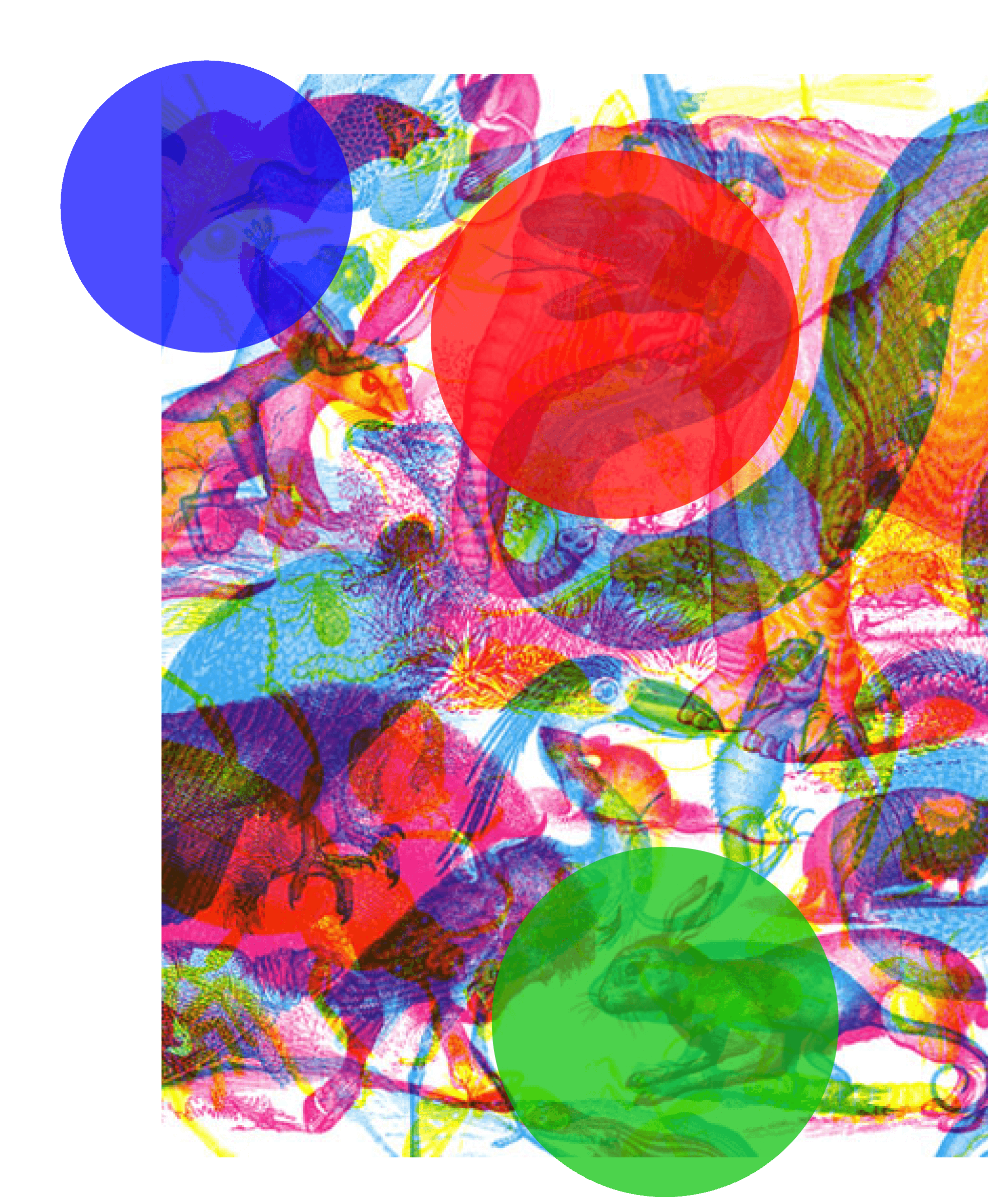 We drew inspiration from Milan-based artists Carnovsky, whose RGB series uses layered CMY (cyan, magenta, yellow) prints that transform under different colored lighting. When viewed through red, green, or blue filters, different visual layers become visible, demonstrating both additive and subtractive color principles.