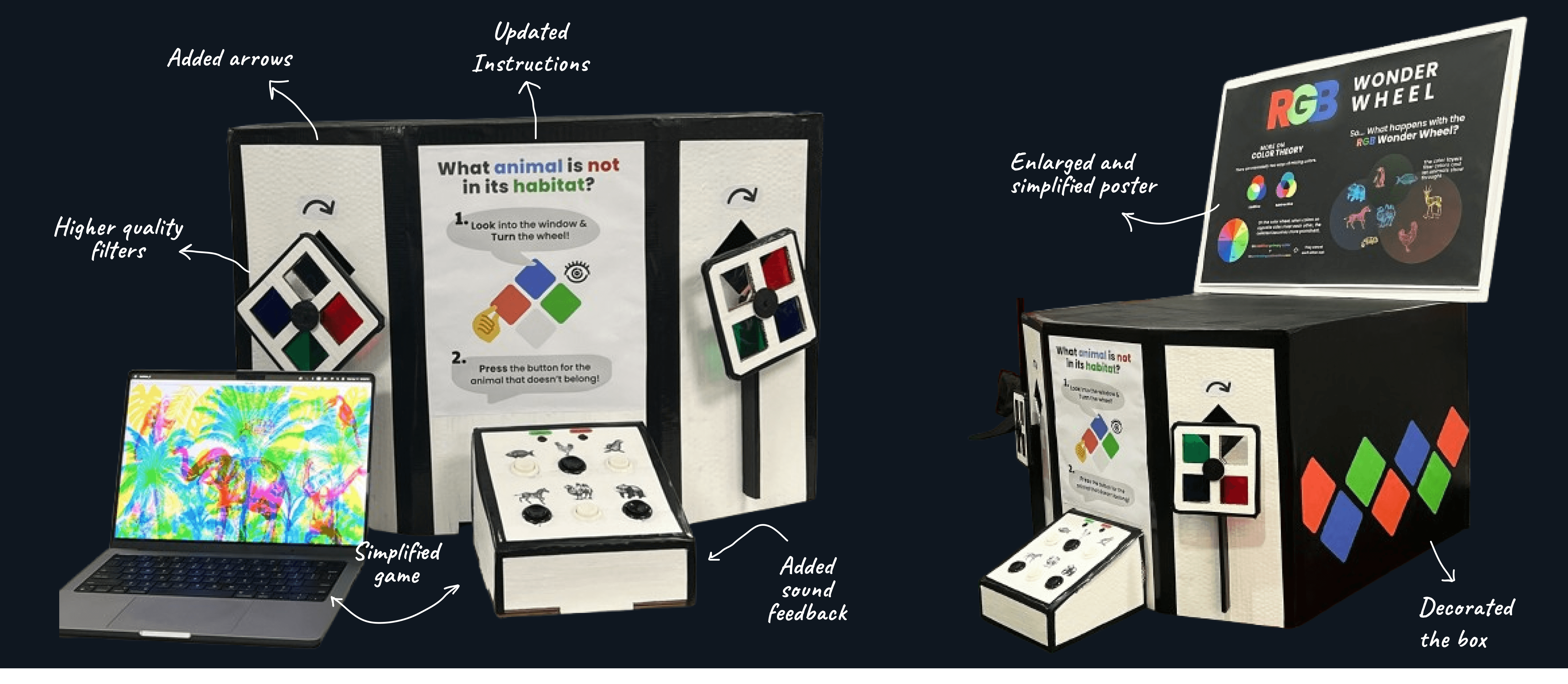 Expanded the viewing box, added animated habitats, and introduced a button box with LED feedback. Our first test with real museum visitors was a success, children eagerly spun wheels and pressed buttons, showing strong engagement.